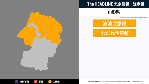 1月14日21時50分頃、山形県に波浪注意報・なだれ注意報が発表
