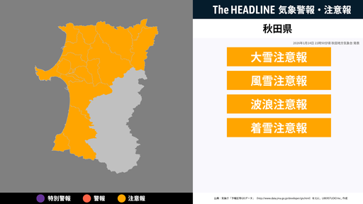 1月14日21時50分頃、秋田県に大雪注意報・風雪注意報などが発表