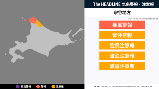 11月16日18時21分頃、宗谷地方に暴風警報・雷注意報などが発表