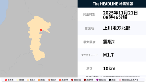11月21日8時46分頃、北海道で最大震度2の地震を観測