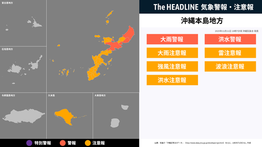 11月11日18時7分頃、沖縄本島地方の大雨警報・洪水警報などが更新
