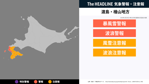 1月20日3時22分頃、渡島地方・檜山地方に暴風雪警報・波浪警報などが発表