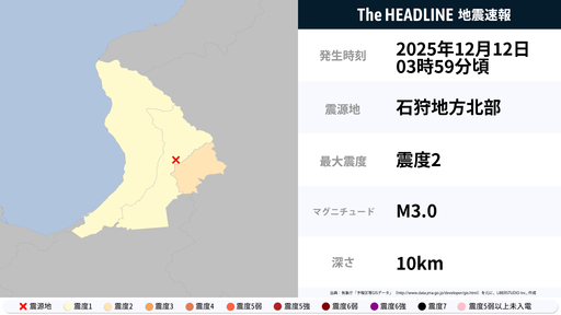12月12日3時59分頃、北海道で最大震度2の地震を観測