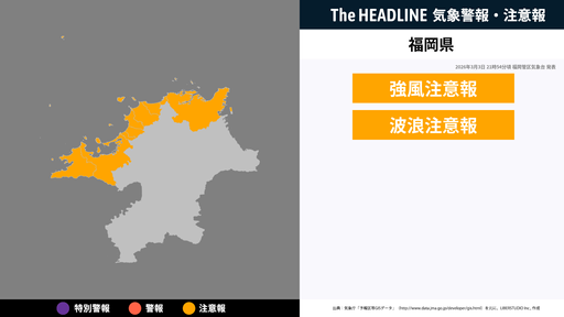 3月3日21時54分頃、福岡県の強風注意報・波浪注意報が更新