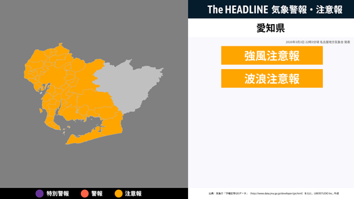 3月3日22時3分頃、愛知県に強風注意報・波浪注意報が発表