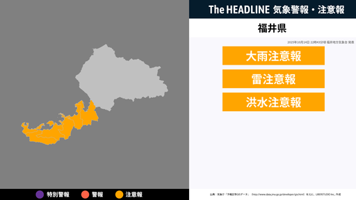 10月14日22時43分頃、福井県に大雨注意報・雷注意報などが発表