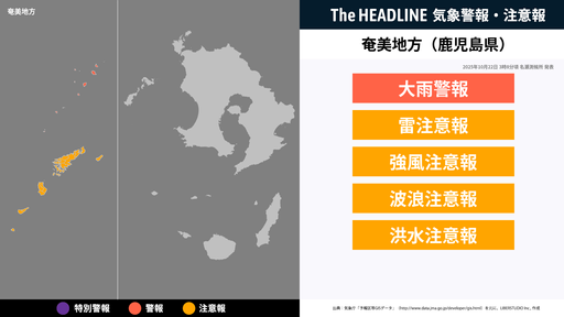 10月22日3時8分頃、奄美地方の大雨警報・雷注意報などが更新