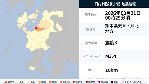 3月21日0時29分頃、熊本県で最大震度3の地震を観測