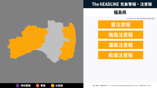1月15日16時5分頃、福島県の雷注意報・強風注意報などが更新