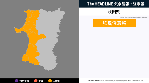 12月14日7時5分頃、秋田県の強風注意報が更新
