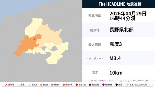 4月29日16時45分頃、長野県で最大震度3の地震を観測