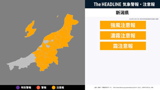 11月17日1時44分頃、新潟県に強風注意報・濃霧注意報などが発表