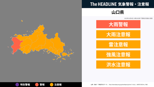 10月4日13時18分頃、山口県の大雨警報・大雨注意報などが更新