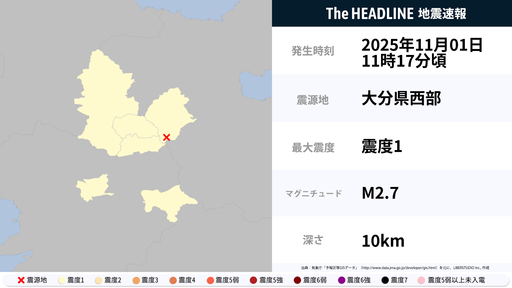 11月1日11時17分頃、熊本県・大分県で最大震度1の地震を観測