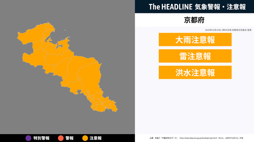 10月15日1時56分頃、京都府に大雨注意報・雷注意報などが発表