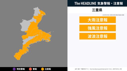 3月3日19時30分頃、三重県に大雨注意報・強風注意報などが発表