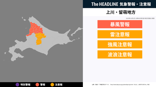 12月1日12時46分頃、上川地方・留萌地方の暴風警報・雷注意報などが更新