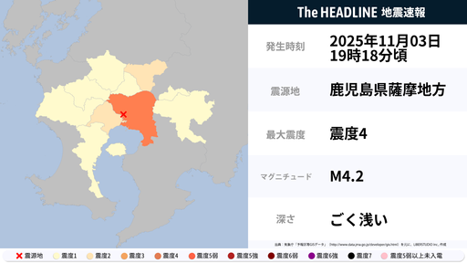 11月3日19時18分頃、鹿児島県で最大震度4の地震を観測