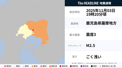 11月3日19時21分頃、鹿児島県で最大震度3の地震を観測