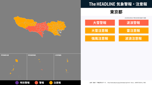 2月8日7時38分頃、東京都に大雪警報・波浪警報などが発表