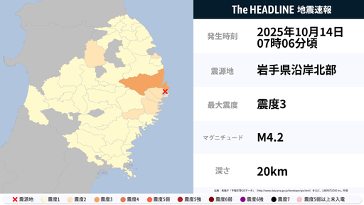 10月14日7時6分頃、岩手県で最大震度3の地震を観測
