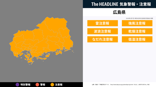 2月7日9時38分頃、広島県に雷注意報・強風注意報などが発表