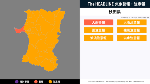 12月11日13時11分頃、秋田県の大雨警報・大雨注意報などが更新