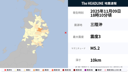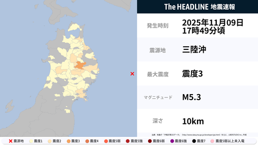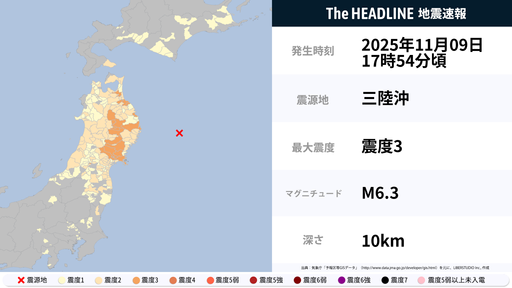 11月9日17時54分頃、青森県・岩手県などで最大震度3の地震を観測