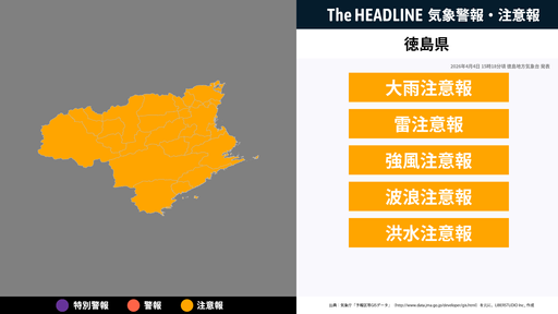 4月4日15時18分頃、徳島県の大雨注意報・雷注意報などが更新