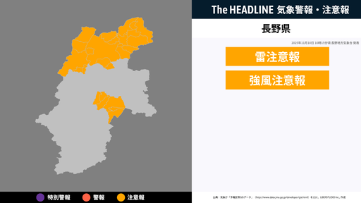11月10日10時15分頃、長野県に雷注意報・強風注意報が発表