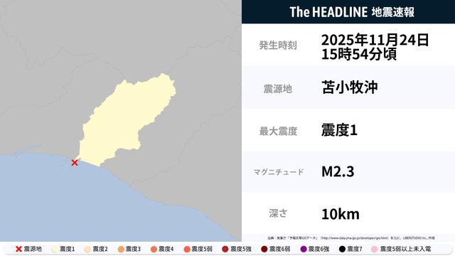 11月24日15時54分頃、苫小牧沖を震源とするマグニチュード2.3の地震が観測された。最大震度1を観測したのは、北海道。