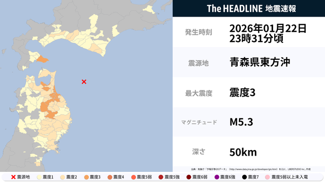 1月21日2時51分頃、北海道・青森県で最大震度3の地震を観測