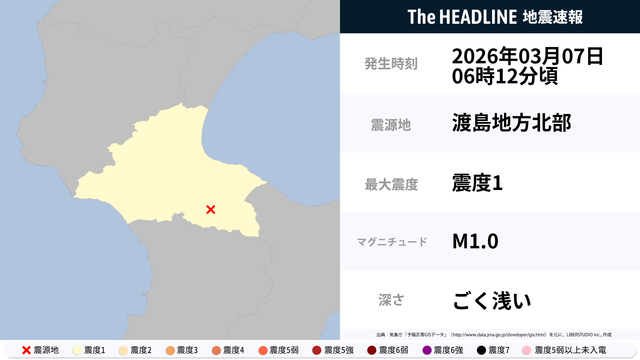3月7日6時12分頃、北海道で最大震度1の地震を観測