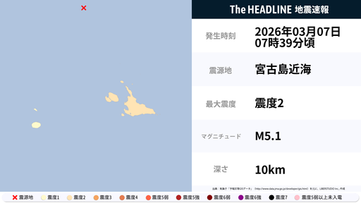 3月7日5時35分頃、岩手県・宮城県で最大震度2の地震を観測