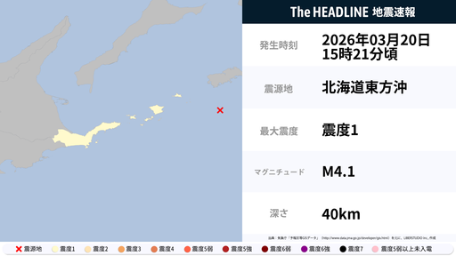 3月20日15時21分頃、北海道で最大震度1の地震を観測