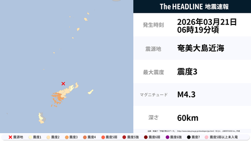 3月21日6時19分頃、鹿児島県で最大震度3の地震を観測