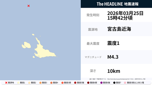 3月23日18時59分頃、宮古島近海を震源とするマグニチュード4.3の地震が観測された。最大震度1を観測したのは、沖縄県。