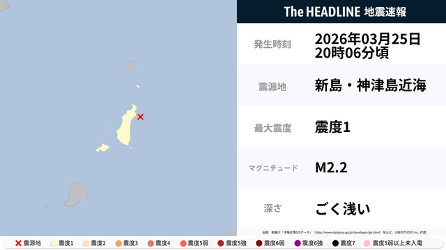 3月23日18時59分頃、沖縄県で最大震度1の地震を観測