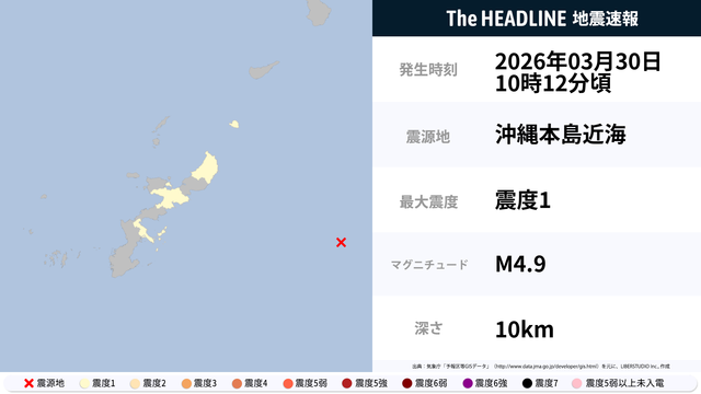 3月30日10時12分頃、沖縄本島近海を震源とするマグニチュード4.9の地震が観測された。最大震度1を観測したのは、鹿児島県・沖縄県。