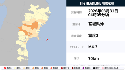 3月30日10時5分頃、宮城県で最大震度2の地震を観測
