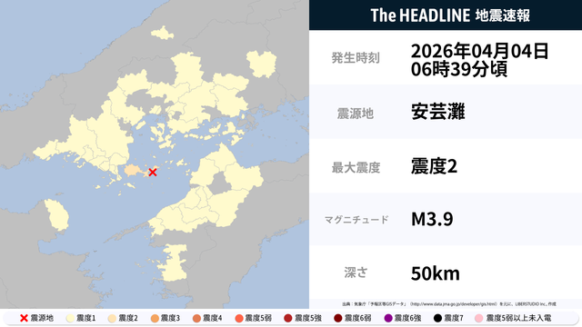 4月4日6時39分頃、山口県で最大震度2の地震を観測
