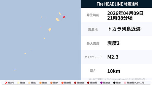 4月9日21時38分頃、トカラ列島近海を震源とするマグニチュード2.3の地震が観測された。最大震度2を観測したのは、鹿児島県。