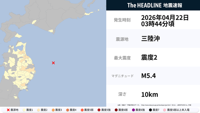4月20日23時15分頃、三陸沖を震源とするマグニチュード4.6の地震が観測された。最大震度1を観測したのは、青森県・岩手県。