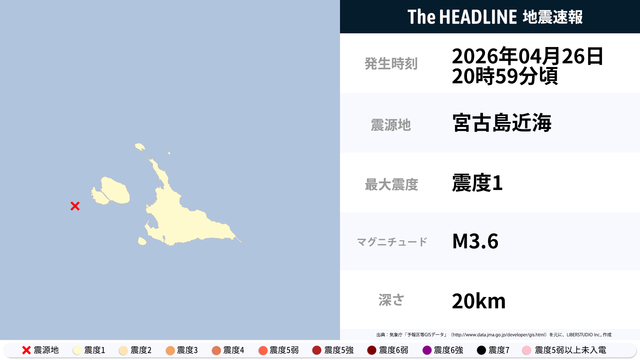 4月24日7時53分頃、鹿児島県で最大震度1の地震を観測