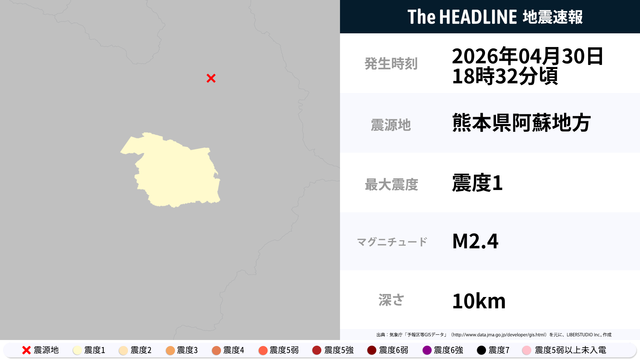 4月30日18時32分頃、熊本県で最大震度1の地震を観測