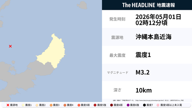 05月01日02時12分頃、沖縄本島近海を震源とするマグニチュード3.2の地震が観測された。最大震度1を観測したのは、沖縄県。