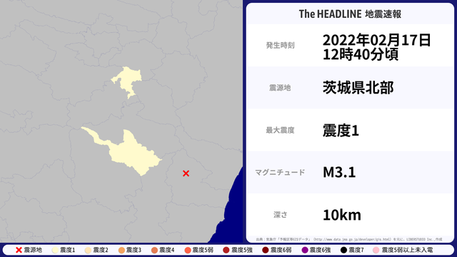 02月17日12時40分頃、茨城県北部を震源とするマグニチュード3.1の地震が観測された。最大震度1を観測したのは、福島県。
