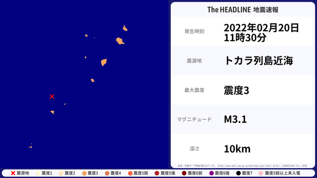 02月20日11時30分頃、トカラ列島近海を震源とするマグニチュード3.1の地震が観測された。最大震度3を観測したのは、鹿児島県。