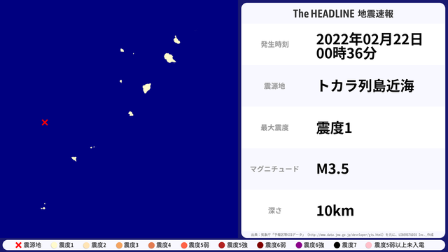02月22日00時36分頃、トカラ列島近海を震源とするマグニチュード3.5の地震が観測された。最大震度1を観測したのは、鹿児島県。