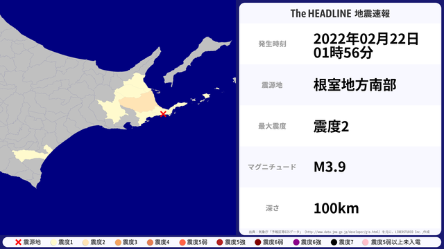 02月22日01時56分頃、根室地方南部を震源とするマグニチュード3.9の地震が観測された。最大震度2を観測したのは、北海道。